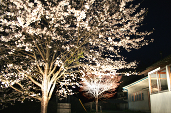 工房前にある立派な桜の樹が、車のライトでライトアップされて、