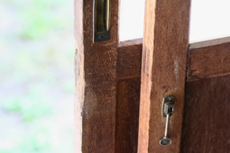 キャメル色の革の把手、四方をかこんだナチュラル色のタモ、正面のチョコ色はウォールナット、