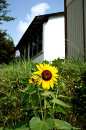あらためて見回してみれば、真っ青な夏空、工房の入り口にはひまわり。